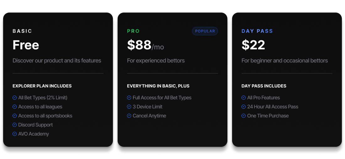 A perfect starting point for newcomers, this option introduces users to AVO with access to pre-match and live arbs/EV/middles/low-holds yielding returns of up to 2%. It's a hands-on way to familiarize yourself with AVO's interface and functionality entirely for free.