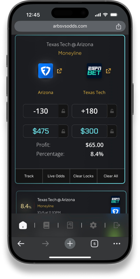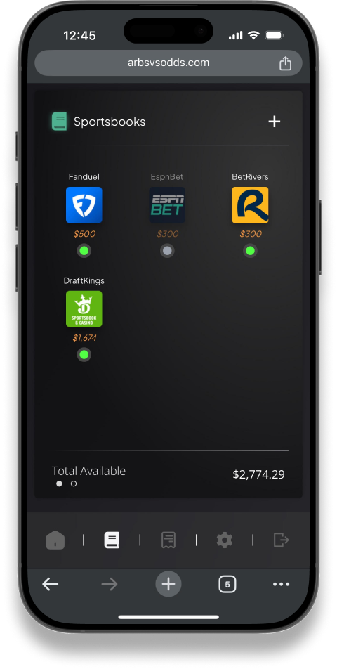 At the top of the calculator you'll see the bet information as well as the books involved. Clicking on the icon of a book will open the sportsbooks app automatically (make sure you have it installed on your phone and you're logged in). The icons with a moving animation support One-Click Bet and will open the bet slip on the sportsbook app with your bet ready to place (you'll still need to enter the wager amount yourself). The icons without an animation will open to the page containing the game on the sportsbook app.