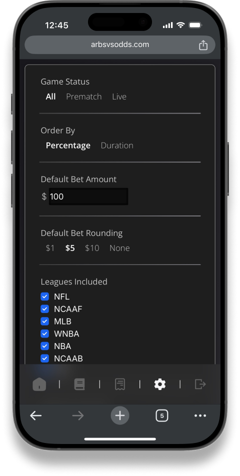 The last section is the filters page. Just as the desktop version, you can display live bets, pregame, or both. You can also adjust the ordering, minimum %, location, and filter out sports and markets. Additionally, you can edit default bet amount and rounding here (these will apply to all books).
