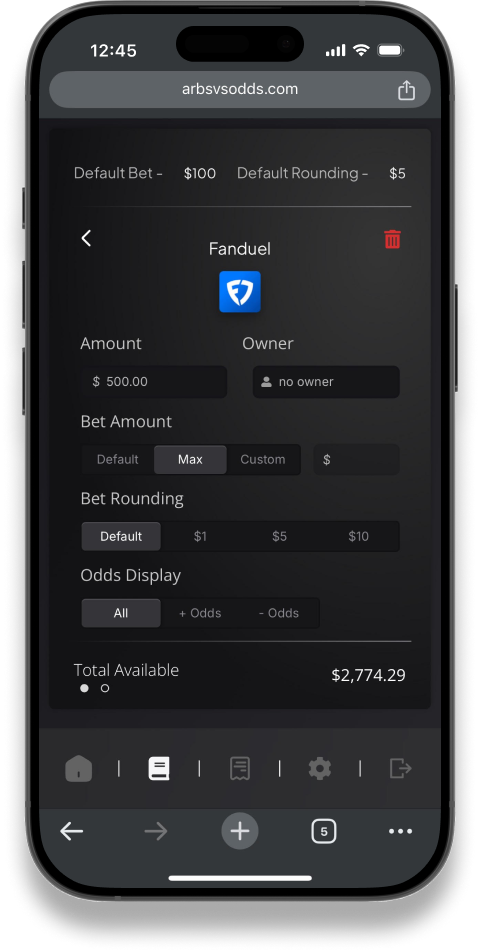 Clicking on the icon of a sportsbook will take you into the settings for that book. From here you can enter the bankroll amount and owner, as well as access bet amount, bet rounding, and odds display settings. To remove a sportsbook, click the delete icon on the top right, then click delete on the popup.